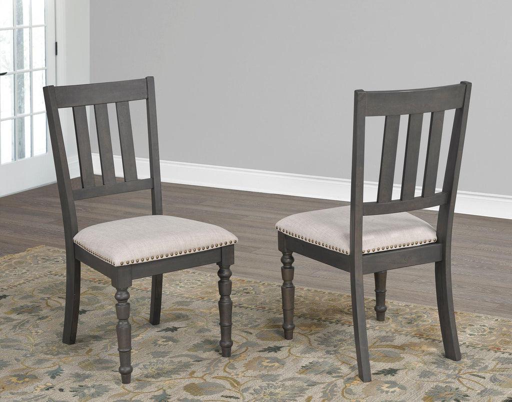 Gather around the Claudia 7pc Dining Set and let a modern twist on traditional elegance take you on a journey of lasting comfort. This inviting set features a beautiful dark grey finish, a removable table leaf, and distinctive detailing on the legs, along with sophisticated nail head accents to complete the look. Invite your guests and enjoy every meal in style!