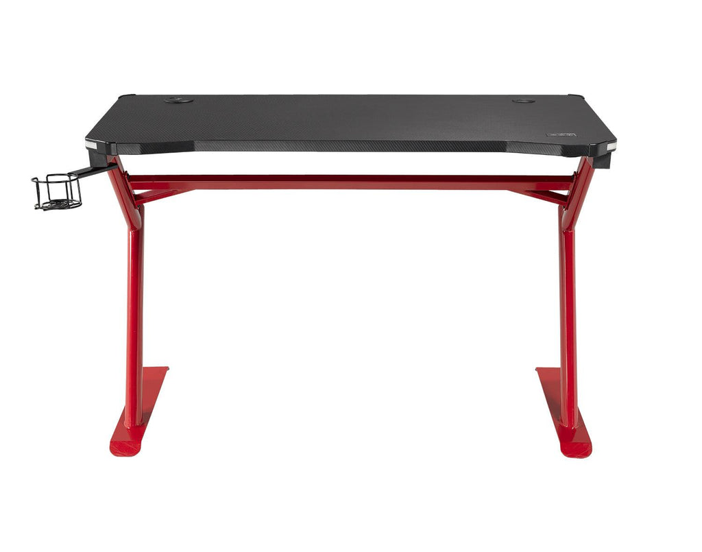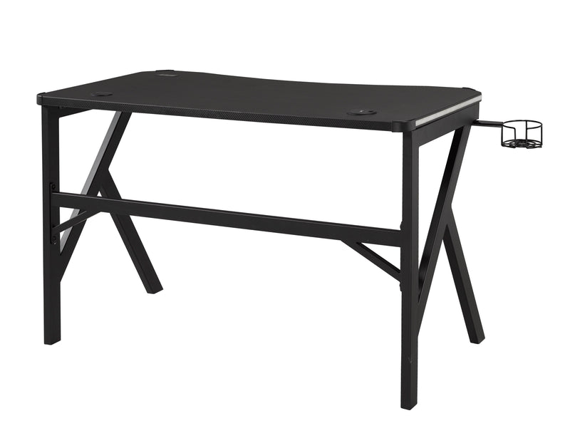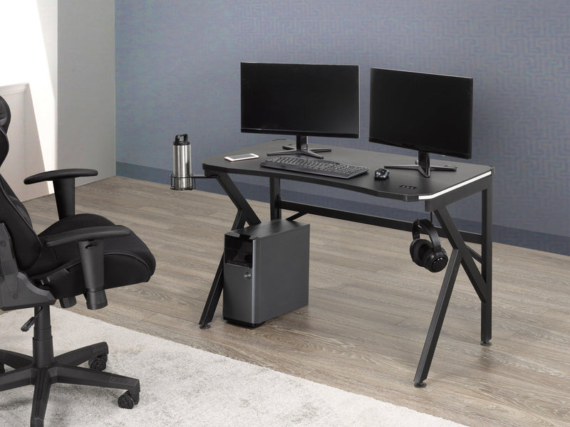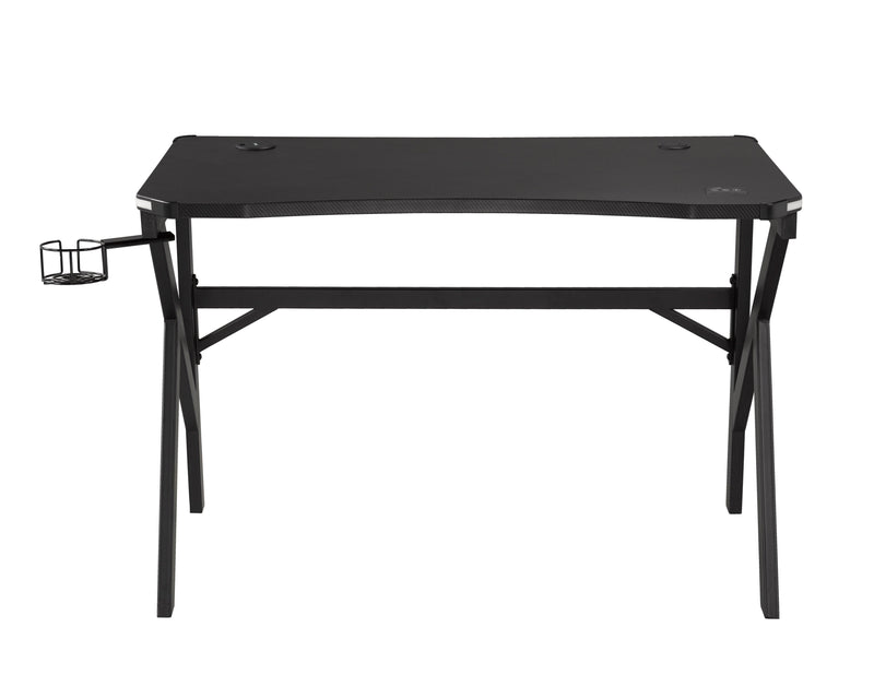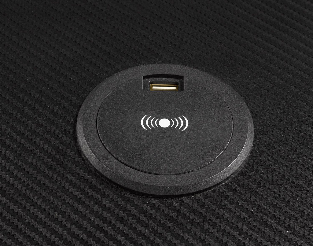 Create a modern gaming environment in your living space with the Etro Gaming Desk! Multi-level LED lighting with touch control allows for the most optimal gaming experience. The built-in headset and cup holders keep your playing essentials easily within reach for those long online gaming marathons! Integrated wireless and USB charging stations keep you connected at all times. The contemporary frame features a powder-coated iron tube for long-lasting use, while the carbon fiber-inspired top adds a sophisticated touch to the professional design. The perfect addition for any passionate gamer, this multi-functional desk is sure to impress.