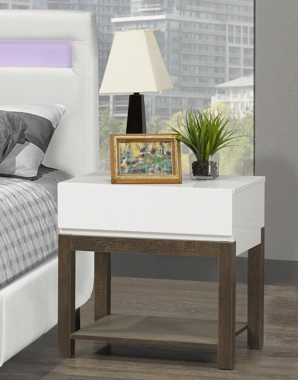 The White/Walnut Nightstand - B64 is the perfect addition to your bedroom. Combining modern beauty and functionality, this nightstand will last for years to come with its durable construction and unique base design. Enjoy clutter-free nights with its handy storage drawer and open shelf, perfect for storing all your bedside necessities. Its sleek look and versatile design make it a timeless piece that will bring style and convenience to your home.