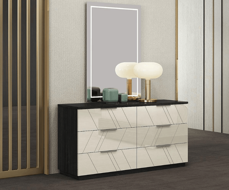 The Travis Bedroom Set is designed for luxurious comfort and style. Its two-tone grey colour palette will add sophistication to any bedroom decor. The four-drawer chest includes a built-in mirror and jewelry storage, while the two-drawer nightstand has convenient wireless charging. The 6-drawer double dresser has an LED mirror and provides plenty of storage space. Finally, the solid wood platform bed with headboard, footboard, and slats provides maximum support for a great night's sleep. Experience unparalleled comfort today!