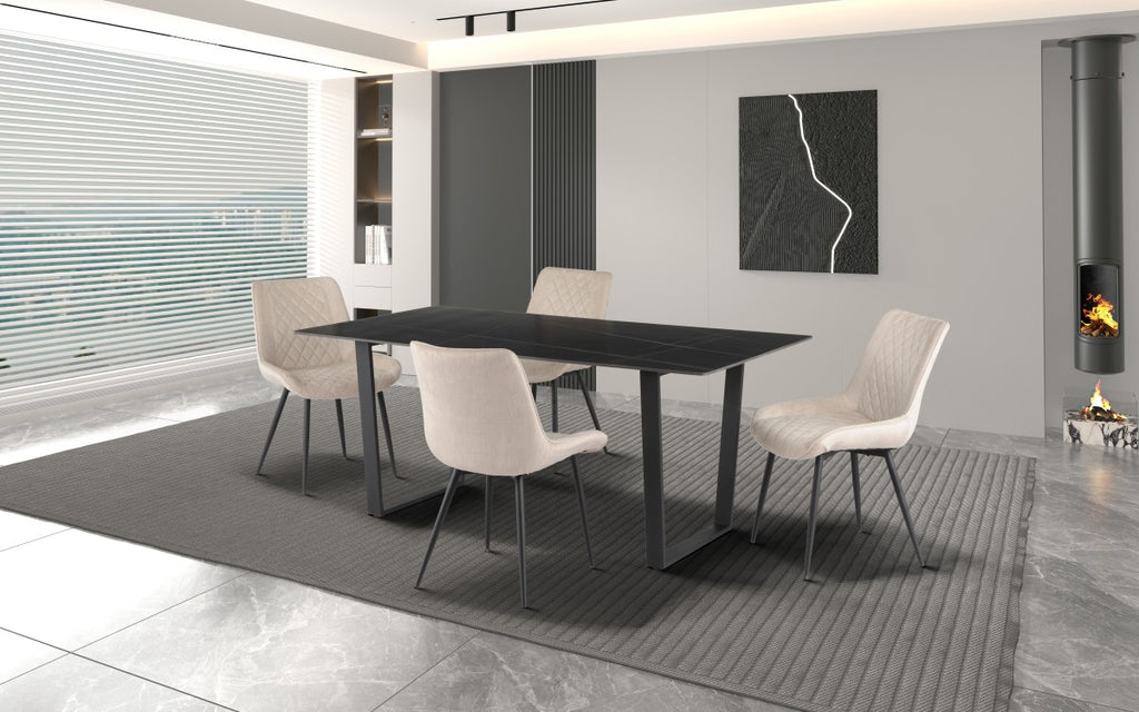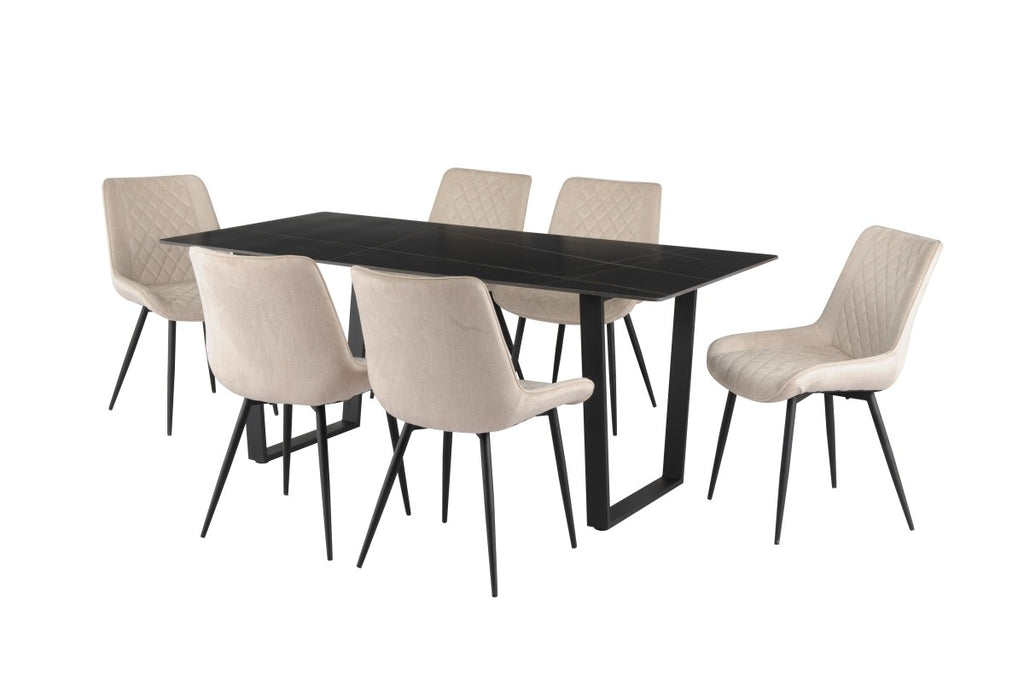 The Zion dining set includes a stylish table and six chairs, making it an ideal choice for your dining space. The contemporary design of the Zion set will instantly elevate the ambiance of your dining room, giving it a fresh and trendy look. The table features a 12mm ceramic tabletop adorned with cascading veins, a design element that adds a touch of sophistication with distinctive pattern. The ceramic surface is not just beautiful but also incredibly resilient, guaranteeing that your dining table remains a statement piece for years to come. Complementing the elegant tabletop are the black powder-coated splayed legs. These legs offer both stability and a sleek, modern aesthetic, ensuring that your dining area is not only stylish but also sturdy. The Zion Dining Chairs are designed with tufted accents, adding a layer of comfort and luxury to your dining experience. These details not only enhance the visual appeal of the chairs but also provide a cozy and inviting place to sit during meals and gatherings.