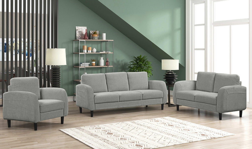 Transform your living room with this contemporary 3-piece sofa set that combines style and comfort. Upholstered in soft-touch grey fabric, it features gently rounded arms and clean lines with subtle stitched detailing for a modern aesthetic. The supportive high-density foam seating ensures everyday comfort, while the durable frame construction is built to last. Tapered black legs add a sleek finish that complements any décor. This versatile neutral piece is the perfect foundation for any living space.