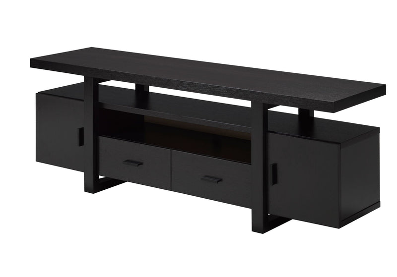 This 60" TV Stand imbues your living space with beauty and function. Boasting a sleek design and a rich dark cherry finish, it offers a contemporary style that suits a range of décors. With ample open and closed storage space, your home stays clutter-free and organized, while aesthetically pleasing bar pulls give it a modern look. Make a statement in your home with this stunning yet functional TV stand!