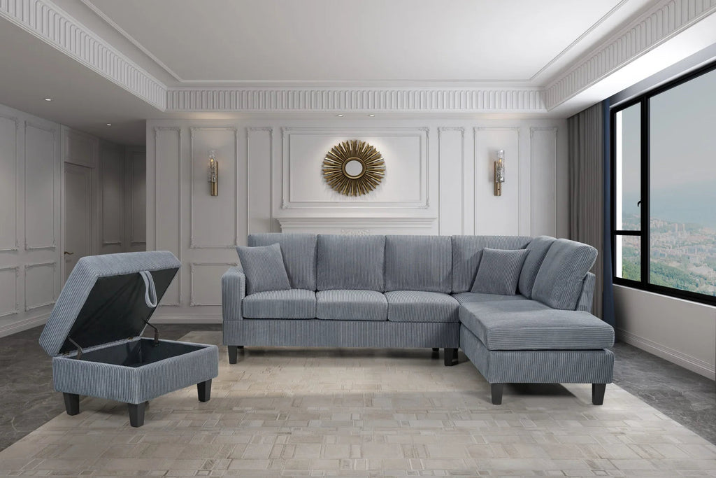Experience versatile comfort with the Cassidy Sectional, featuring soft and durable grey velvet corduroy upholstery that adds texture and style to your living space. Its reversible chaise offers flexible seating arrangements to suit any room layout. Included are a spacious storage ottoman and plush throw pillows, combining practicality with cozy accents to enhance your relaxation. Elevate your home with this stylish and functional sectional designed to adapt to your lifestyle.