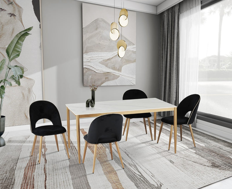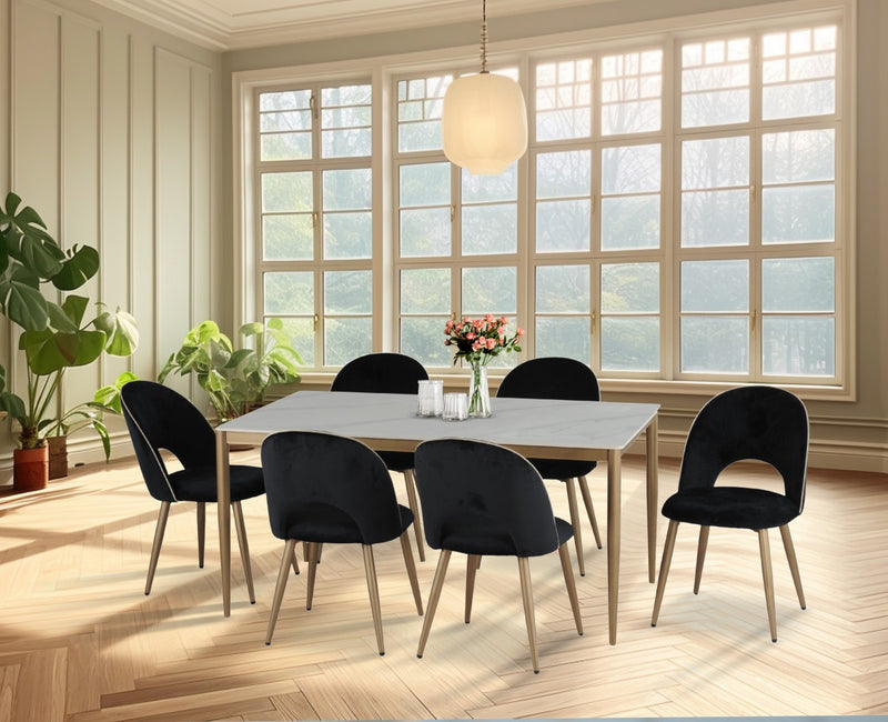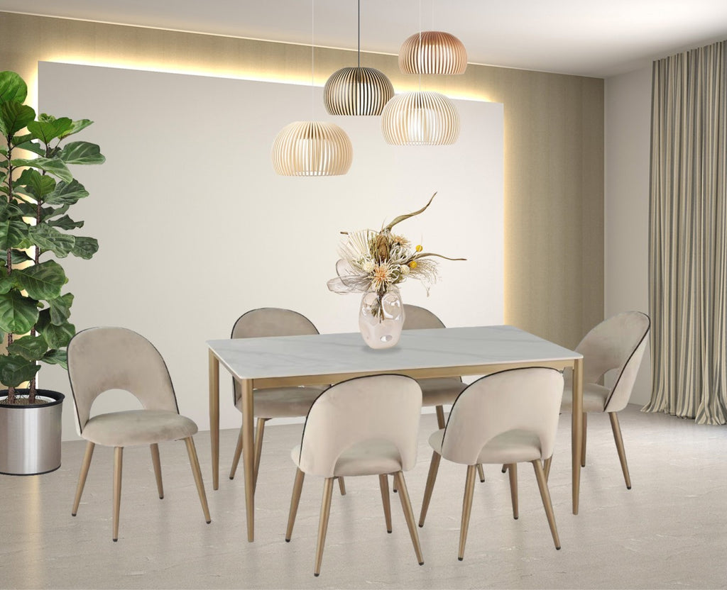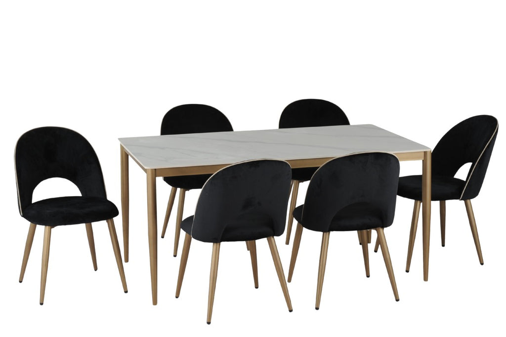 The Emilia Dining Set features a grand ceramic top table that's supported by golden powder-coated legs. The inviting curved back chairs are upholstered in premium velvet fabric for an added touch of luxury. Enjoy mealtimes with a dining set that's both beautiful and durable!