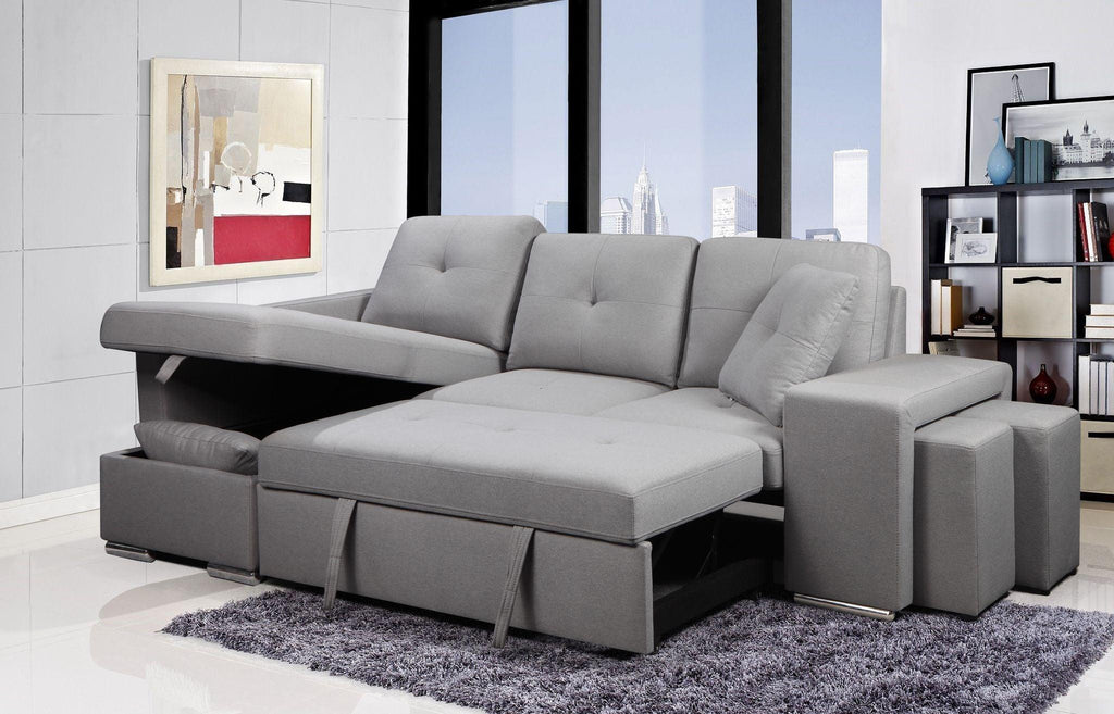 Add a touch of style and extra seating to your living room with the George Sleeper Sectional, a graceful, grey-linen fabric sofa with comfortable cushions and thick, high-back padding. Transform your sofa into a bed with ease, and store away items in its chaise storage. Get two cube ottomans for extra seating, plus matching pillows for a complete look! Stylish and sophisticated β a must-have for any home.