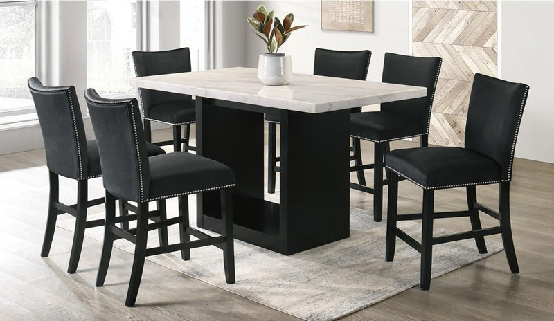 Elevate your dining experience with our Orlando 7pc Pub Set! This modern set features a sturdy White Marble pub-height table top and solid wood legs for durability and style. The black velvet fabric dining chairs add a touch of elegance with chrome nailheads, providing both comfort and style. Enjoy with friends and family in any space!