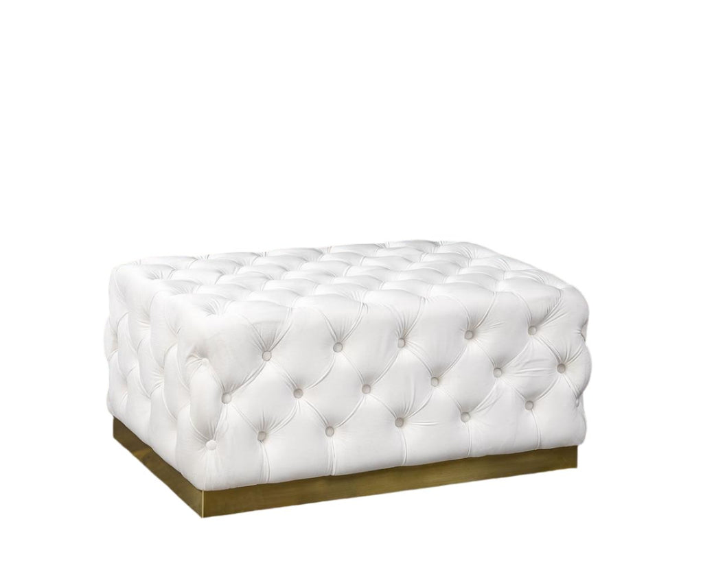 Upgrade your living space with the Portia Ottoman in Gold! The beautiful beige velvet upholstery and stainless steel gold base exude sophistication, while the tufted style and button finish add extra elegance. The thick fabric padding ensures comfort for all the lucky guests who sit on it. Make a statement today!