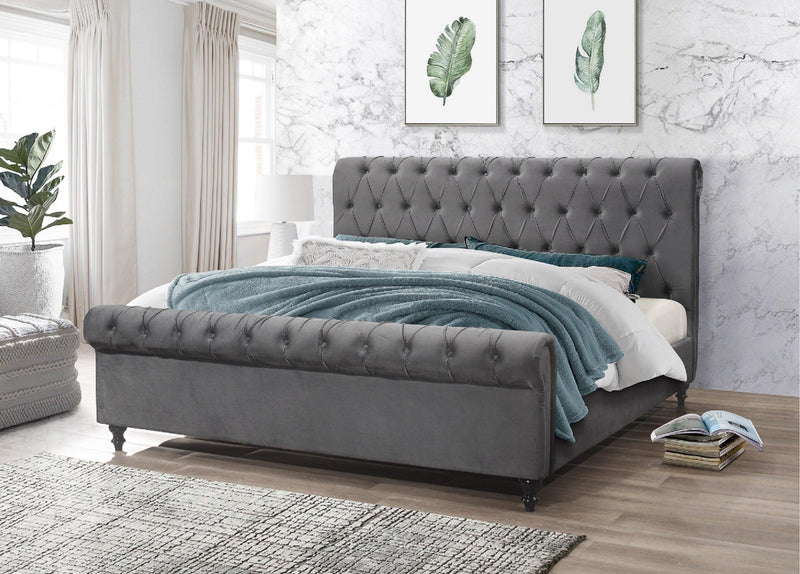 Sink into luxury with the IF-197 Velvet Sleigh Bed! Crafted with a sublimely soft grey velvet fabric, and featuring a mattress support included, this exquisitely designed bed will transform your bedroom into a sanctuary of comfort and tranquillity. Sweet dreams await!