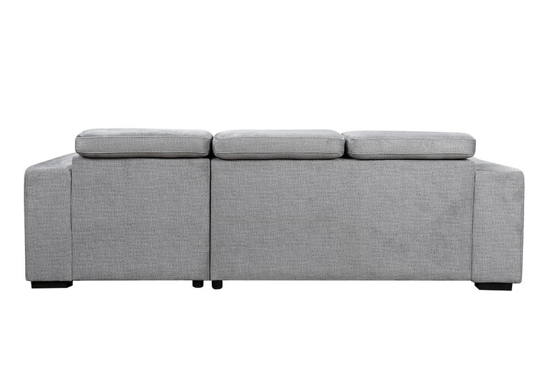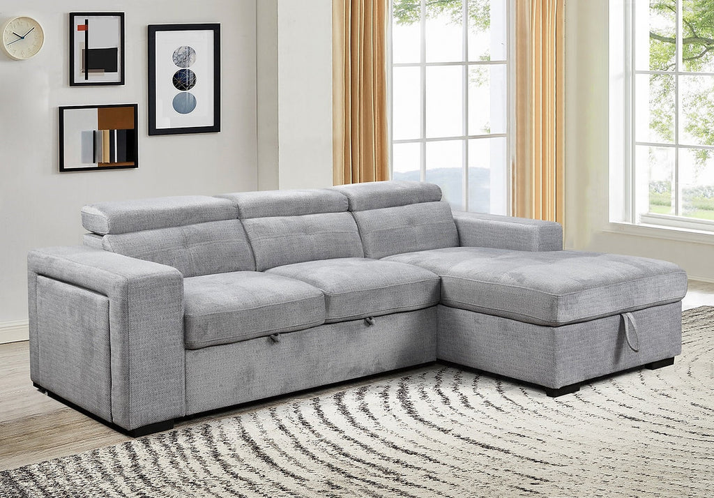 Elevate your living space with the versatile Sofa Bed Sectional - IF-9080! Unwind in style with the pullout popup bed, adjustable headrests, lift-up storage chaise, and plush tufted back and seat. Stay connected and organized with the built-in wireless charging pad and side compartment with cup holder. Available in soft grey fabric.