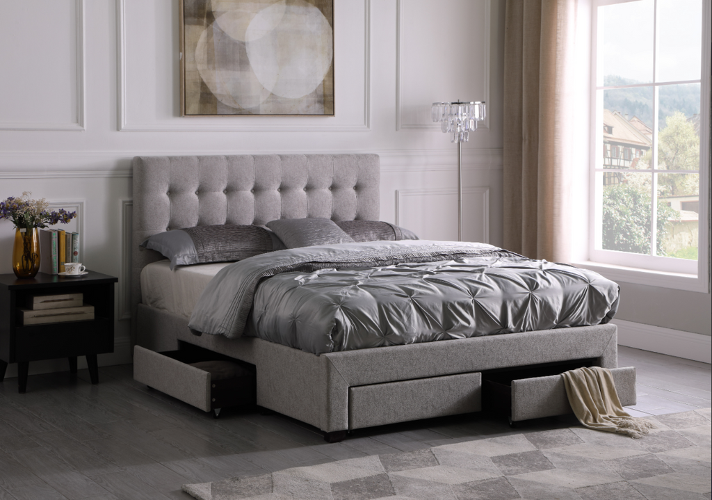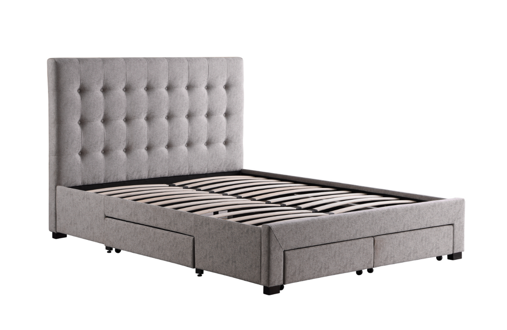 Bring sleek sophistication to your bedroom with the timeless style of this Storage Bed. Upholstered in a plush fabric with tufted accents, this bed offers a strong bentwood slat system to evenly disperse weight and eliminate the need for box springs. Its four storage drawers provide ample space to organize all your sleeping and everyday essentials. Bring elegance and practicality to your home today!