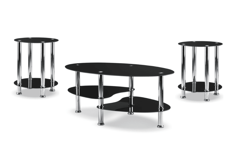 Add a stylish touch to your living room with this 3-Piece Coffee Table Set. Enjoy the sleek and modern design of the black tempered glass top and chrome legs for an elegant look. The 8mm glass is strong and durable, perfect for your home! Transform your space with this sleek, bold piece.