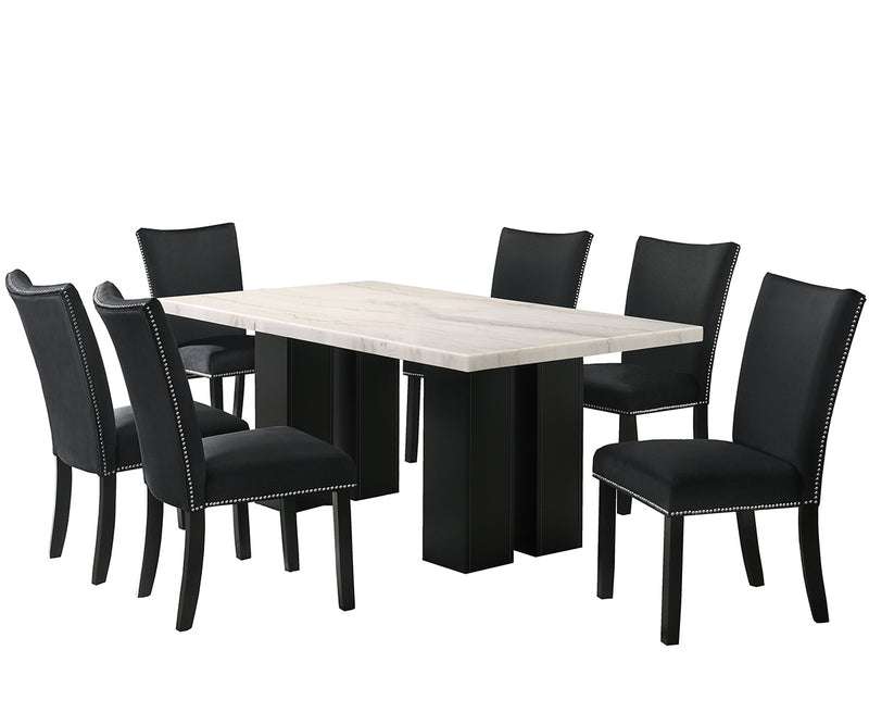 Experience elegance and luxury with the Atlanta 7pc Dining Set. With a 70" White Marble table top and solid wood legs, this modern set is perfect for all your dining needs. The black velvet fabric chairs with chrome nailheads add a touch of sophistication, while the sturdy construction ensures long-lasting use.