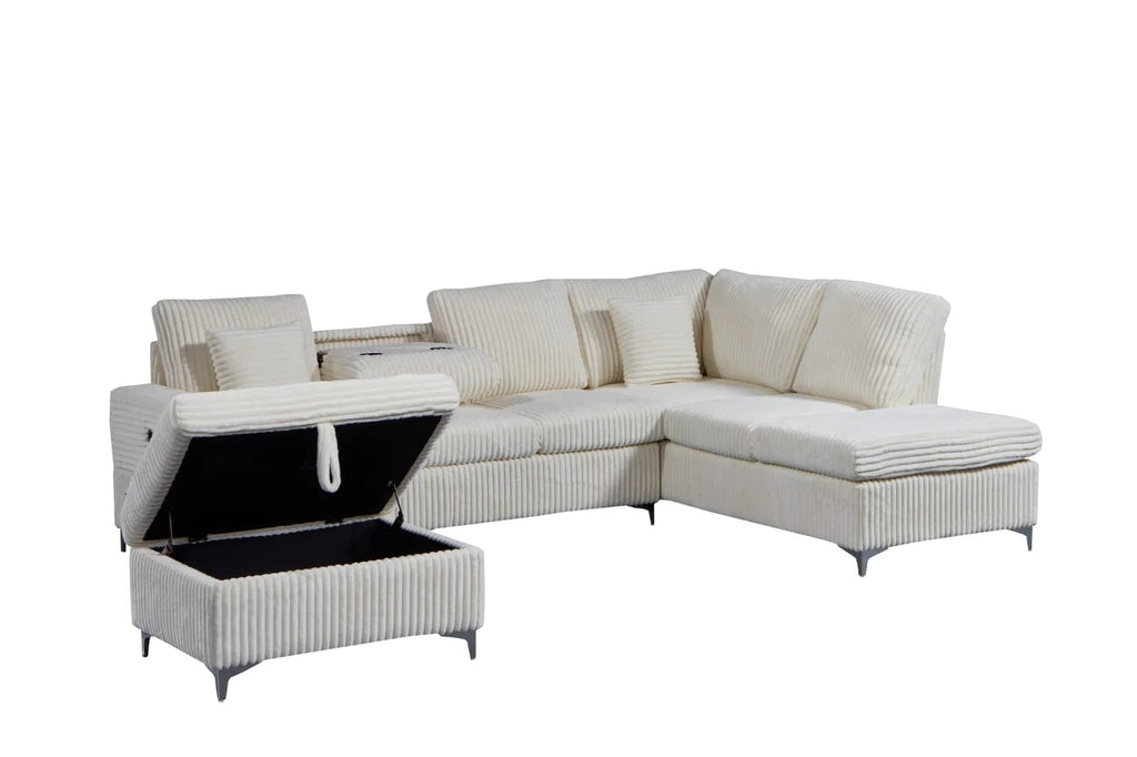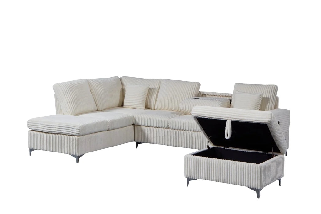The Raphael USB Sectional combines comfort with modern convenience. Wrapped in soft beige corduroy velvet upholstery, this sectional features a reversible chaise to suit your space. The drop-tray includes cupholders for easy beverage access, while built-in USB charging ports keep devices powered throughout the day. Storage ottoman and coordinating throw pillows complete the set, offering both functionality and style for any living room.