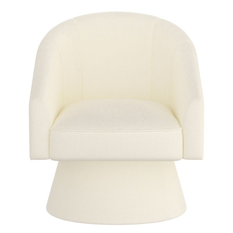This beautiful swivel accent chair will envelope you in comfort. Every element, from the bucket seat to the textured boucle fabric, will come together seamlessly in this perfect little seat. Great in living rooms, bedrooms, or get creative a place as a dining chair in a formal living space.